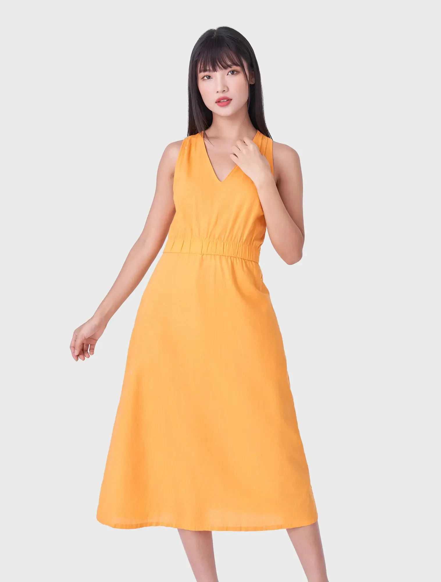 • Thiết kế: Váy liền có kiểu dáng cổ tim sâu tôn lên vẻ nữ tính và thanh lịch. Phần sát nách tạo cảm giác mát mẻ, thoáng khí, phù hợp cho mùa hè.